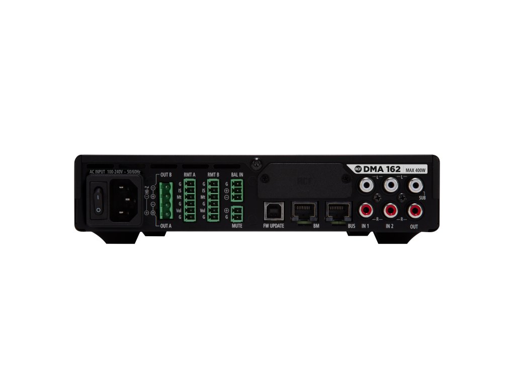 DMA 162 je dvoukanálový maticový řídicí zesilovač pracující ve třídě D, vybavený výkonnou DSP platformou pro správu vstupů a výstupů zahrnující routing a kompletní arsenál processingu včetně PEQ, FIR filtrů, zdůraznění basů, kompresorů, limitérů a equalizace ozvučovaného prostoru.