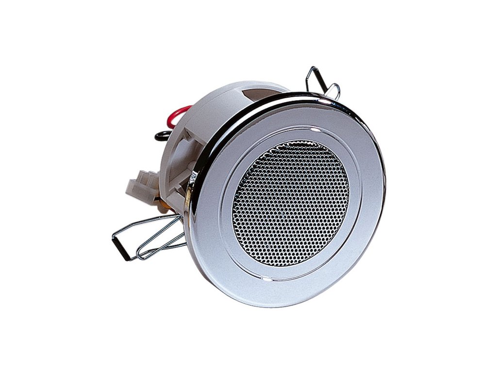 podhledový reproduktor kruhový “Spotlight”, 2,5”, 6 W/100 V, 89 dB, 104×91 mm, 6 mm nad povrch, otvor 92 mm, plast/kov, chromThe HS Series are fullrange speakers that can be flush-mounted in false ceilings like normal halogen spots used in lighting systems.