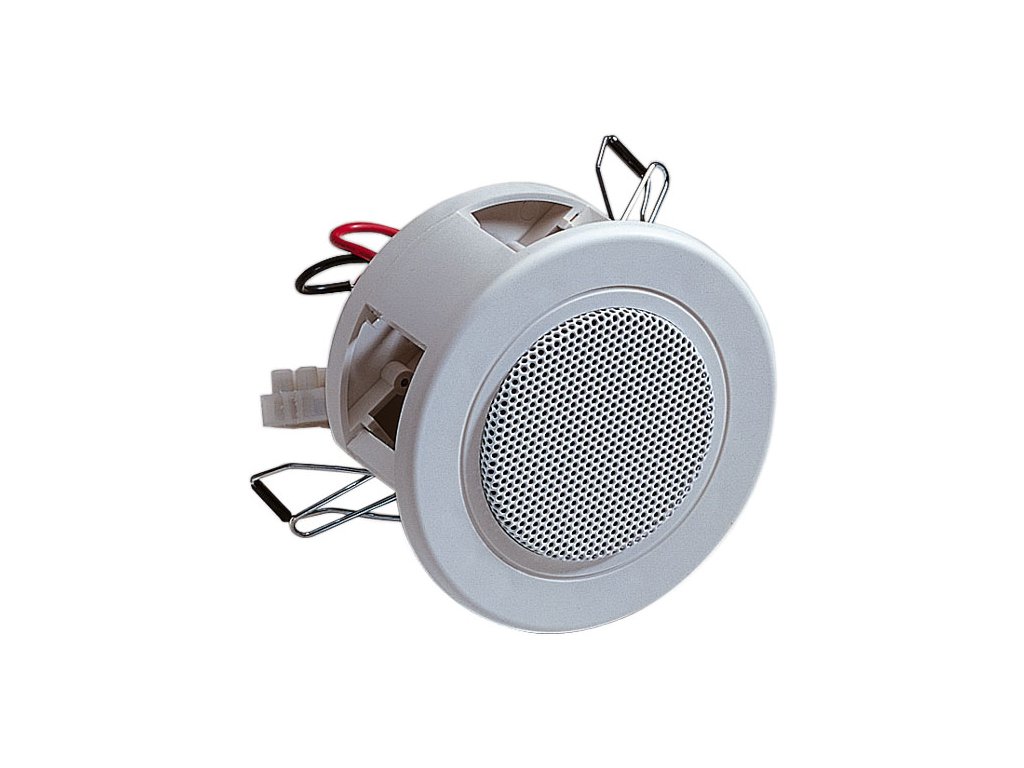 podhledový reproduktor kruhový “Spotlight”, 2,5”, 6 W/100 V, 89 dB, 104×91 mm, 6 mm nad povrch, otvor 92 mm, plast/kov, bílýThe HS Series are fullrange speakers that can be flush-mounted in false ceilings like normal halogen spots used in lighting systems.