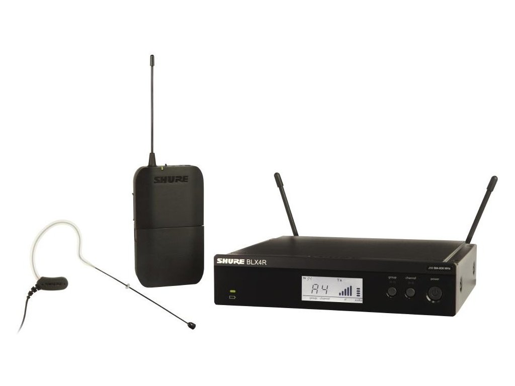 Shure - BLX14RE/MX53 K3E • bezdrátová sada • mikrofon za ucho (earset) MX153 + vysílač BLX1 + přijímač BLX4R • pracovní frekvence: 606-630 MHz