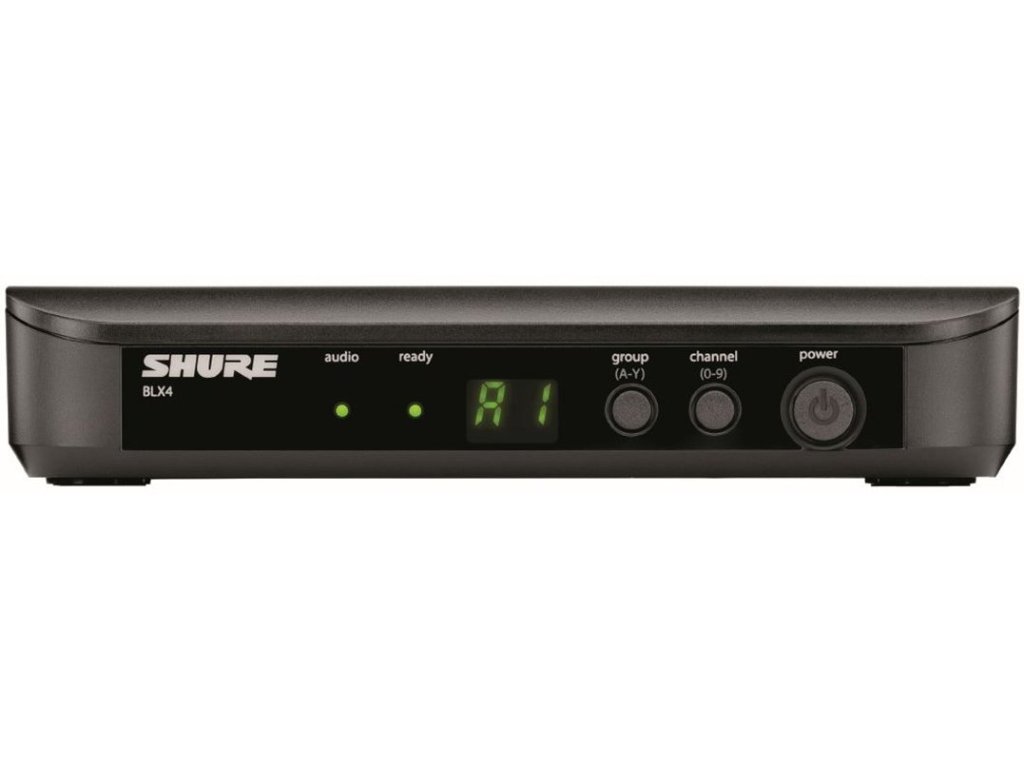 Shure - BLX4E M17 • bezdrátový přijímač • vnitřní anténa • diverzitní konstrukce • automatická synchronizace přijímače/vysílače • dosah: 91 m • možnost provozu až 12 systémů současně • pracovní frekvence: 662-686 MHz