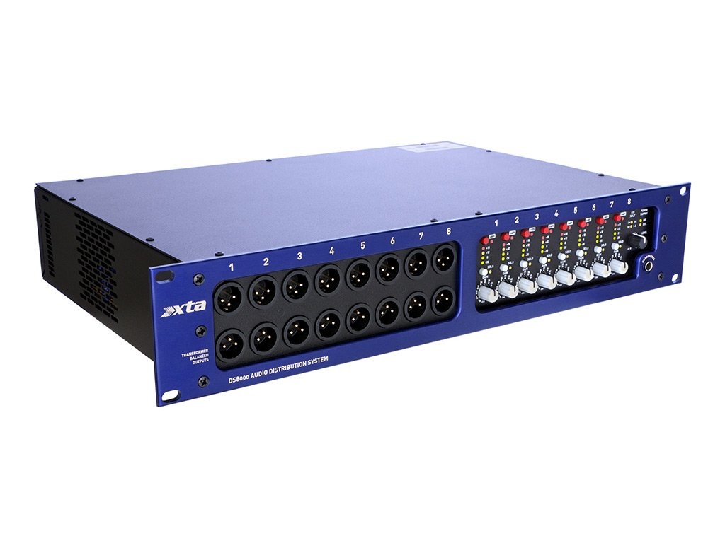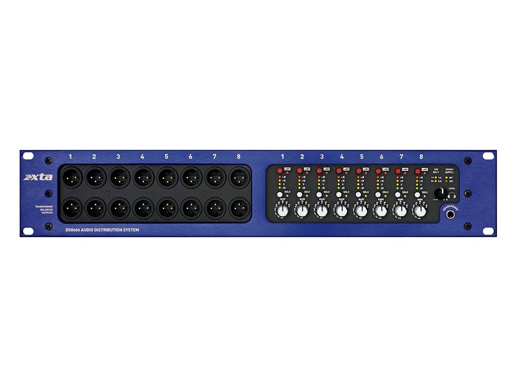 XTA DS8000 je flexibilní odolný profesionální distributor audio signálů mikrofonní nebo linkové úrovně s 8 vstupy, 16 transformátorově symetrickými a 16 elektronicky symetrickými výstupy. Každý kanál disponuje ovladačem gain, přepínačem mic/line, 4-segmentovým LED VU metrem a samostatným fantomovým napájením s indikací a funkcí bezpečného přepínání 48V SAFE v režimech MON, FOH a PANEL. Elektronicky symetrické výstupy lze volitelně nahradit transformátorově symetrickými.