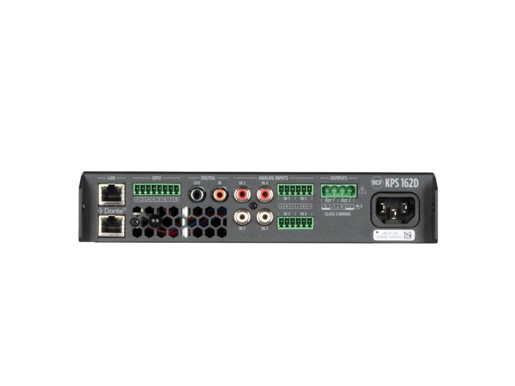 Kompaktní dvoukanálový instalační zesilovač KPS 162D s výkonem 2× 160 W (třída D) je navržen pro moderní distribuované audio systémy. Zásadní předností tohoto modelu je integrované rozhraní Audinate Dante™, které umožňuje bezeztrátovou distribuci až 4 digitálních audio kanálů po standardní síti. Výstupy lze flexibilně nastavit pro nízkoimpedanční i 100V rozvody, přičemž funkce sdílení výkonu (Powershare) dovoluje přesměrovat až 300 W čistě na jeden kanál.