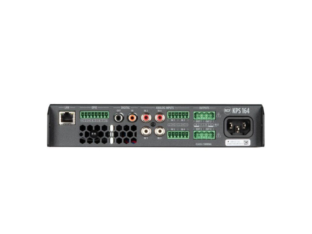 Kompaktní čtyřkanálový instalační zesilovač KPS 164 s výkonem 4× 160 W (třída D) je navržen pro profesionální distribuované audio systémy, které vyžadují vysokou flexibilitu a spolehlivost. Celkový výstupní výkon činí 640 W, přičemž inteligentní funkce sdílení výkonu (Powershare) umožňuje přesměrovat až 320 W v rámci každého páru kanálů. Výstupy lze navíc libovolně konfigurovat pro nízkoimpedanční i vysokoimpedanční (100V) rozvody.